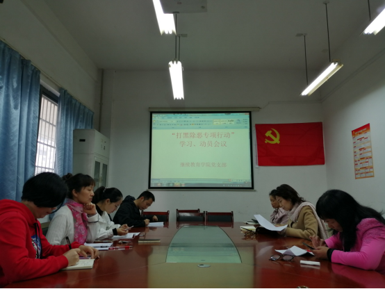 2019年4月1日,继续教育党支部根据上级和公司要求,为保校园和谐平安,切实维护公司的稳定,结合本公司实际,进行了“扫黑除恶”专项斗争知识学习。