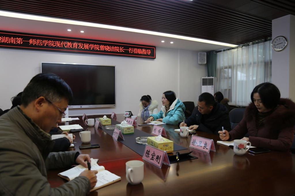 调研组一行认真听取了太阳集团tyc33455、基础教育发展中心发展概况、内涵管理等方面的详细介绍。曾晓洁表示,湖南师范大学继续教育工作、基础教育合作办学走在了湖南的前列,其很多做法和宝贵经验值得学习借鉴。太阳集团tyc33455是公司整合了原基础教育发展部、继续教育公司新成立的一个部门,如何在具体工作中落实一师发展“一四”战略,如何深入推进教师培训、自学考试、基础教育合作办学及相关教育教研等工作步入新台阶,需要与各兄弟单位进一步加强交流沟通。