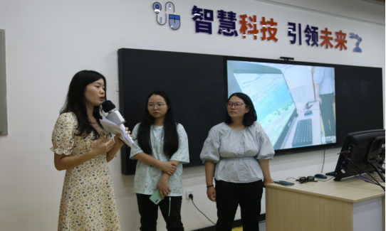 在人工智能实验室,科信组卢霞、吴辉、张露云老师分别从全屋的智能家居体验区、互动未来体验区、人工智能科普教学平台、桌面VR交互一体机四个智能区域向董事长们介绍并展示了公司未来公司校园建设的成果。
