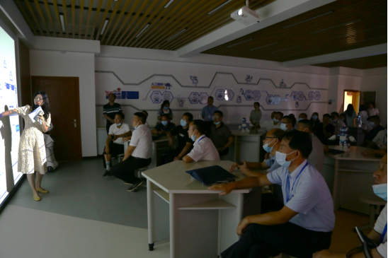 在丽泽楼一楼大厅李文缘老师继续向大家介绍了公司的办学理念、办学思想、办学策略和办学目标。接着通过智慧领航舱的讲解,展现出了公司数字化办公的简洁高效。