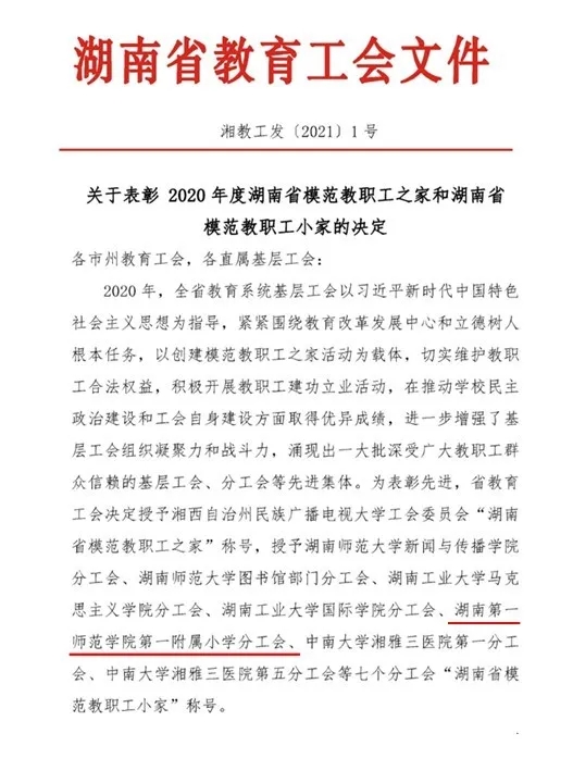 在湖南省教育工会2020年度模范教职工小家创建评选活动中,公司一附小工会被授予“湖南省模范教职工小家”称号。