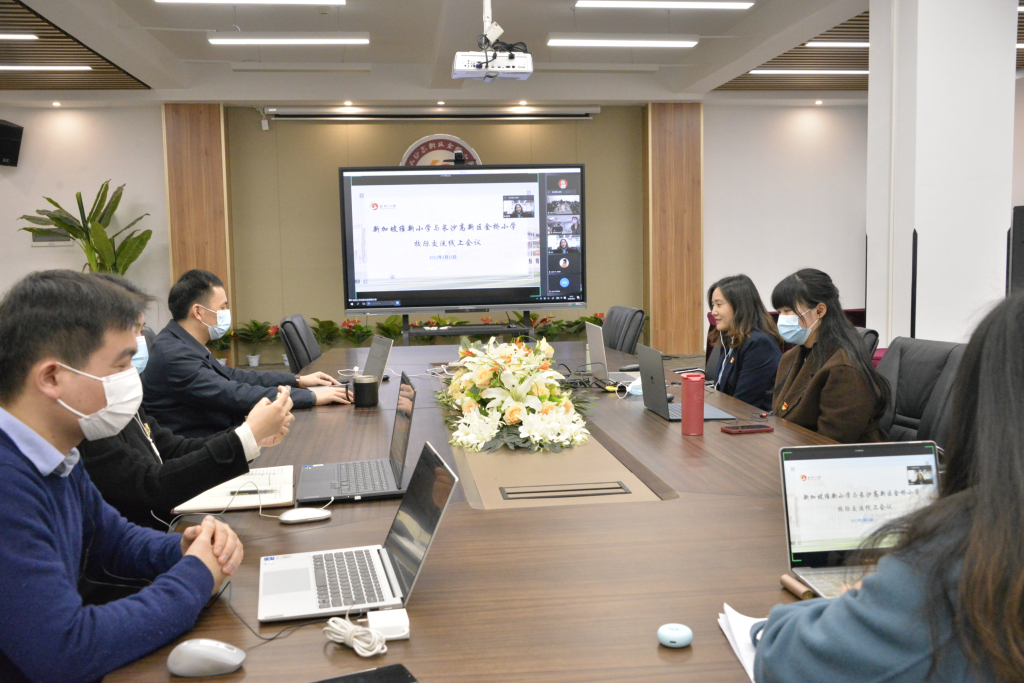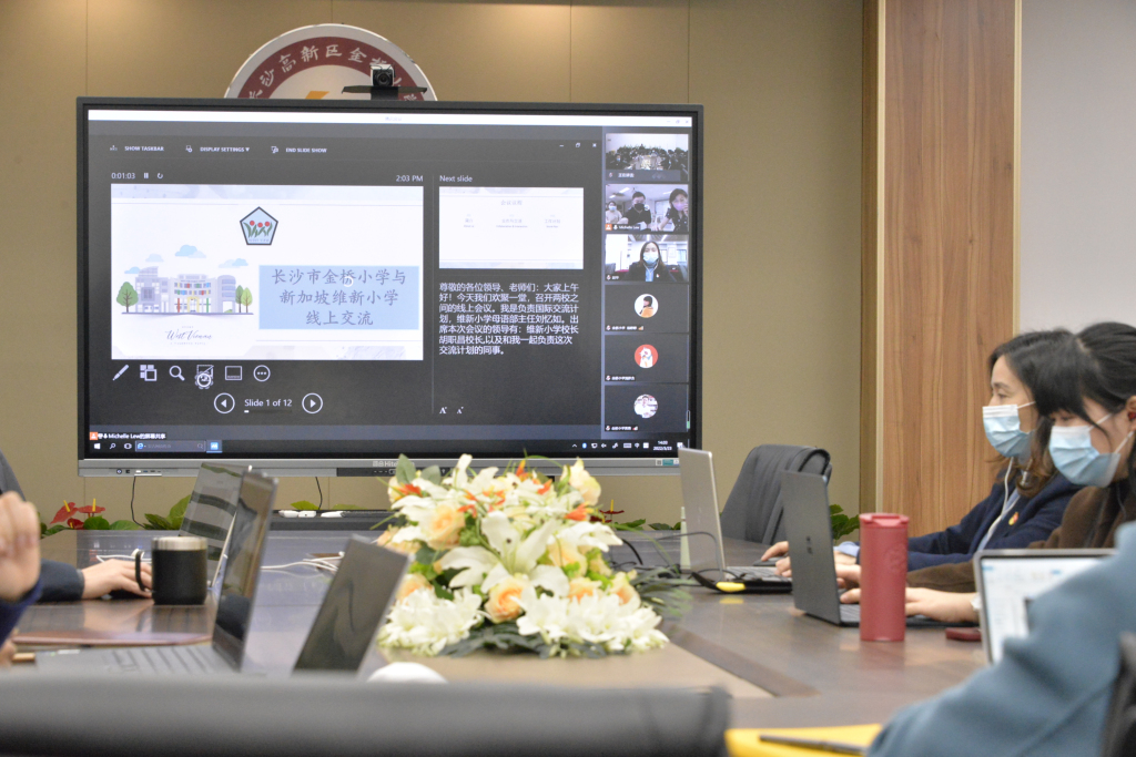 2022年3月23日下午,新加坡维新小学和长沙高新区金桥小学的教师们就两校即将开展的“文化浸润”校际交流活动召开了线上启动仪式。维新小学胡职昌董事长、母语部刘忆如主任、金桥小学赵华董事长、黄勇书记出席了本次会议。