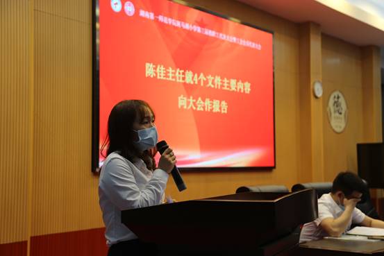 第六项议程,陈佳主任就《教师业绩奖励制度》、《课后服务经费管理办法》、《优秀学科组、年级组考核评分细则》、《教师年度考核自评表》4个文件向大会作报告。旨在增强教师质量意识、责任意识、创新意识、发展意识。