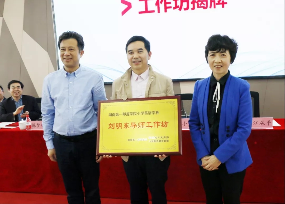 随后,童小娇和江从平为“太阳集团tyc33455刘明东小学英语导师工作坊”揭牌并授牌。工作坊首席导师刘明东教授发表了讲话。刘明东表示,良好的开端是成功的一半,工作坊得到各级领导的大力支持和热情关怀,一定会竭尽全力取得成功。