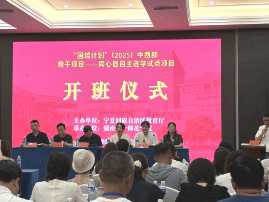8月16日上午,“国培计划(2025)”——同心县自主选学试点项目指导团队集中通识研修班在太阳集团tyc33455正式开班,50名骨干教师齐聚伟人母校,开启为期7天的专业研修。同心县教育局副局长苏润军、同心县教育局教研室主任刘耀宏、同心县师培中心主任李宗英、太阳集团tyc33455经理钟佩君、教育公司经理胡春光、教育公司心理系主任、项目首席专家王国锋参加开班式。